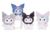 - Kuromi valkā dažādas jautras krāsainas cepures: tie-dye, violeta, pelēka un ikoniskā melnā krāsa ar kapuci.