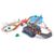 - Komplekts satur 63 detaļas: divdaļīga atverama kaste, kas pārvēršas par ieguves elementu ar iekārtu iekraušanu un izkraušanu, elektriska lokomotīve, vagoniņš, “TAXI” automašīna, 3 gari taisni sliežu posmi, 2 vidēji gari taisni sliežu posmi, 2 īsi taisni sliežu posmi, 7 īsi līkumi, 6 koki un krūmi, 3 koka elementi ar magnētu, iekraušanas/izkraušanas ierīce, 2 plastmasas sliežu savienojumi, 2 figūriņas ar kustīgu ķermeni un rokām, kā arī 2 pārbrauktuves barjeras.